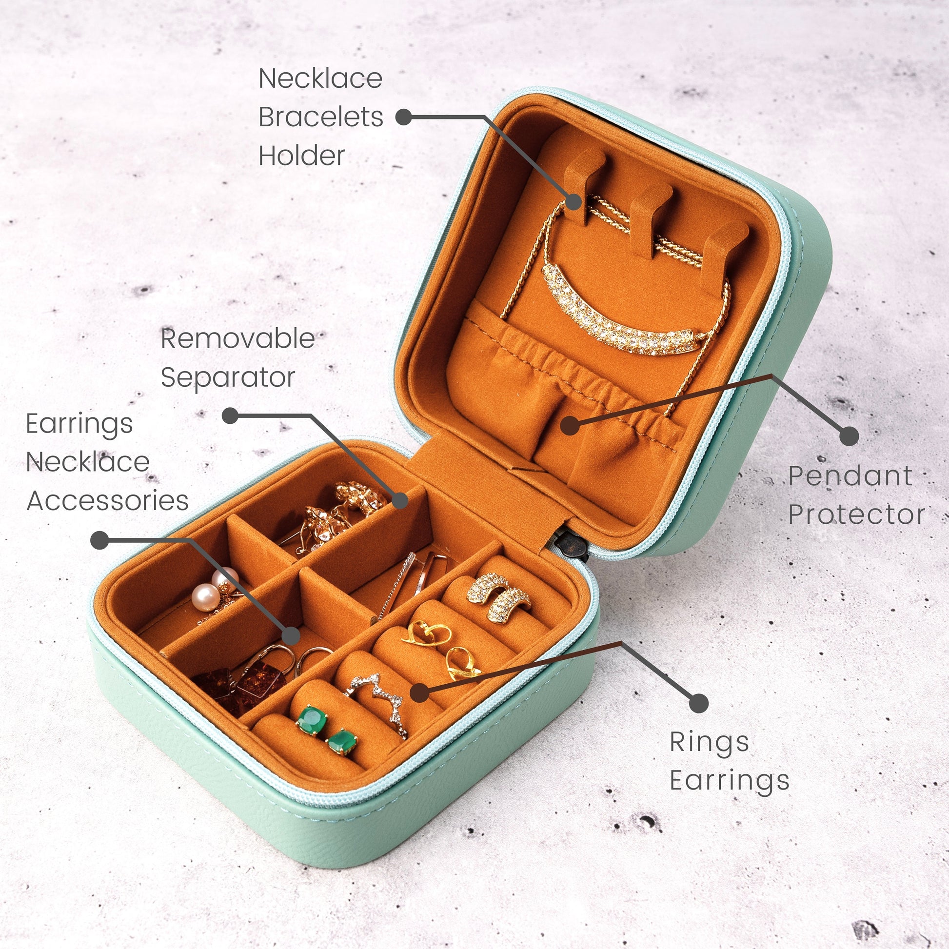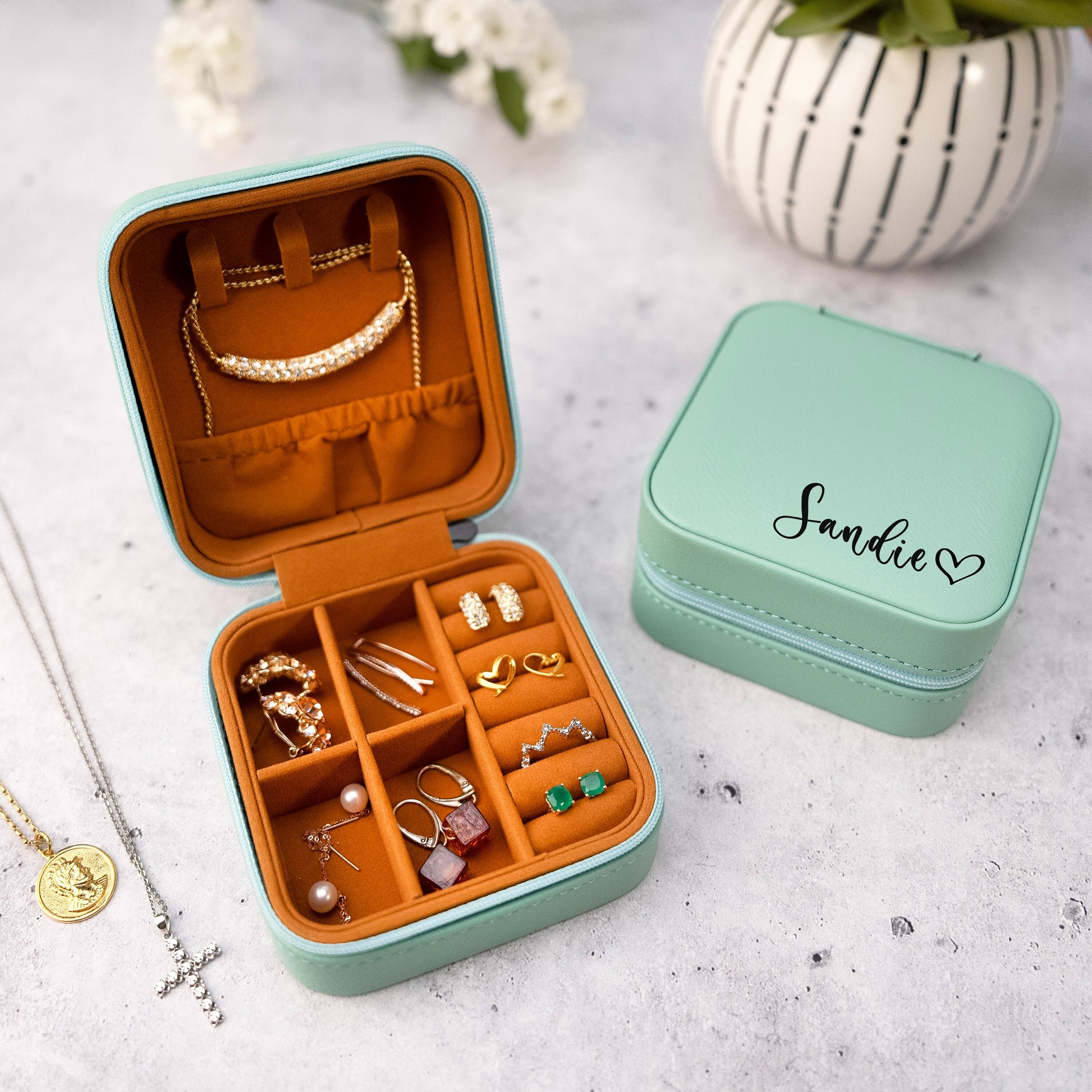 Introducing our Jewelry organizer, a stylish accessory crafted from high-quality vegan leather, perfect for organizing your precious jewelry pieces. Measuring at a convenient size of 4x4x2 inches, it's ideal for storing rings, earrings, necklaces, and more whether at home or on the go. The sleek design and compact size make it a versatile addition to your vanity or travel essentials. Personalize it with initials or a special message for a touch of sentimentality, making it an ideal gift for any occasion.