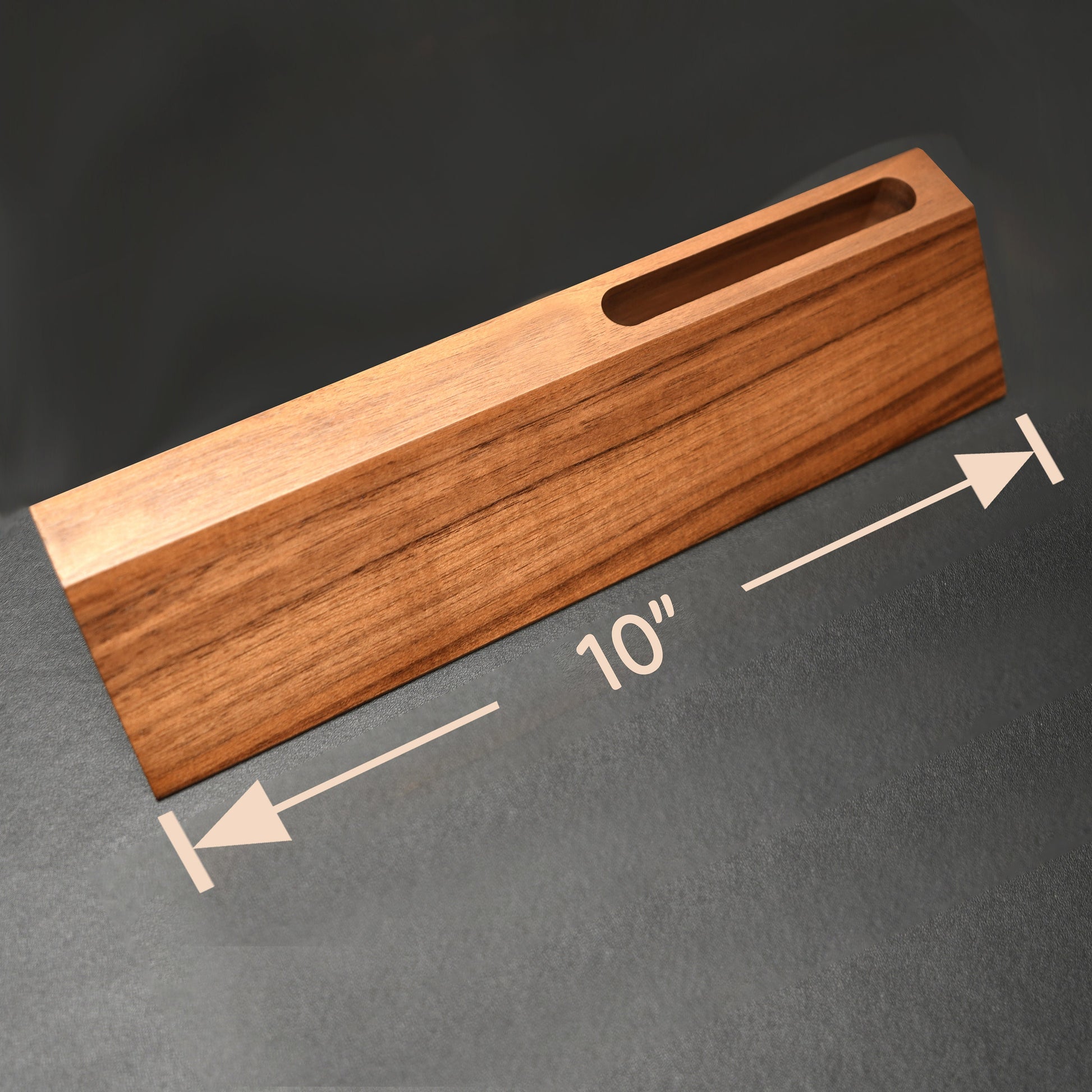 Presenting our Genuine Walnut Desk Wedge, a sophisticated office accessory crafted from solid walnut. Measuring 10 inches and featuring a built-in business card holder, it's perfect for professionals like professors, doctors, or managers. Personalize it with laser engraving or a custom plate for a touch of elegance. Ideal for office decor or as a distinguished gift for professor, mentor, doctor and more.